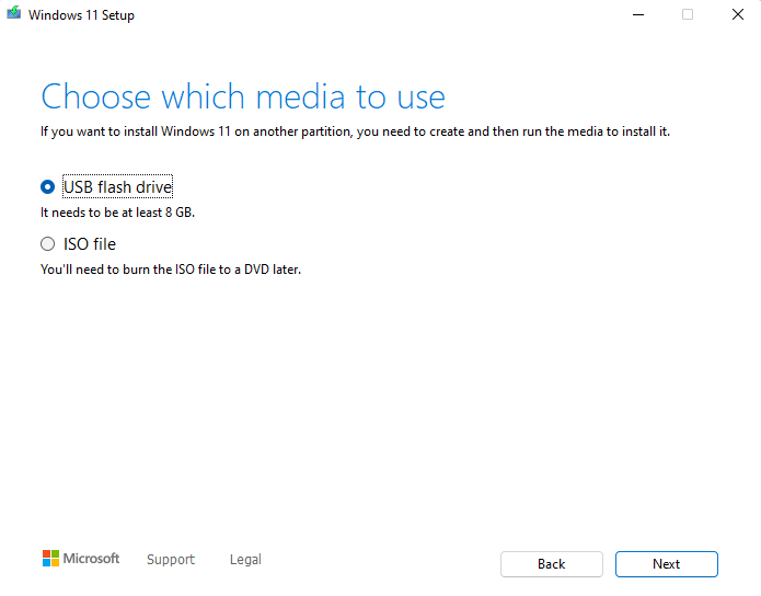 If you select the USB flash drive, make sure you’ve inserted a blank USB flash drive with at least 8GB of free space into your PC before moving forward. If you select the ISO file, you don’t need to worry about anything else for now. Once you’ve chosen, click Next.