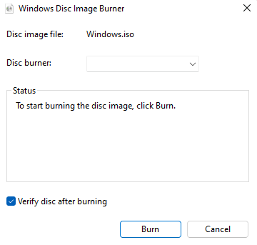 - Select an appropriate disc burner, and select the **Burn **button. Keep the **Verify disc after burning** option checked.