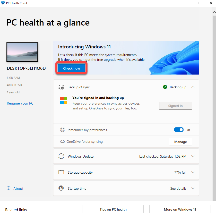 There are several methods to check if you can install Windows 11 on your PC. However, the easiest way is to use the PC Health Check app. Download, install, and run the program, and then click the Check now button.