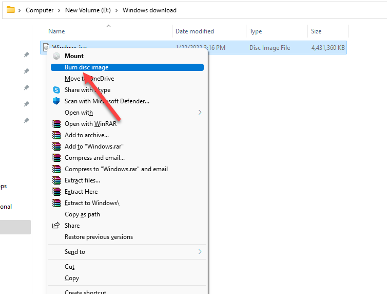 - If you used the Command Prompt in the previous step, you can skip to the next section. If you want to use the graphical interface of the disc burner, go to the folder where you just downloaded your new Windows ISO. Right-click on the ISO file and select **Burn disc image**.