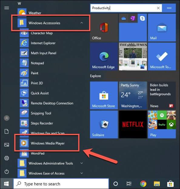 - Once your PC has restarted, you’ll be able to find and open Windows Media Player in your Windows Start menu, under the **Windows Accessories** folder.