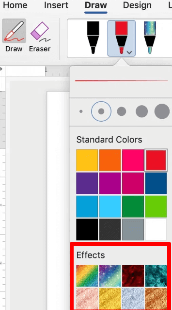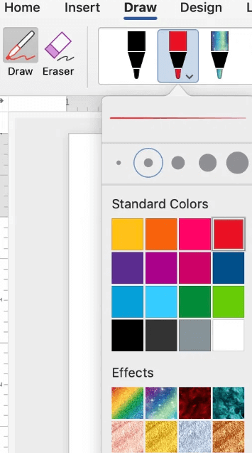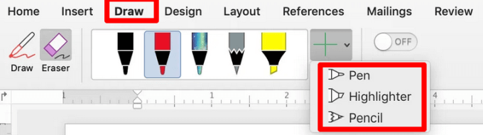 - To draw with Word pen tools, select Draw and then choose Pen, Pencil or Highlighter.