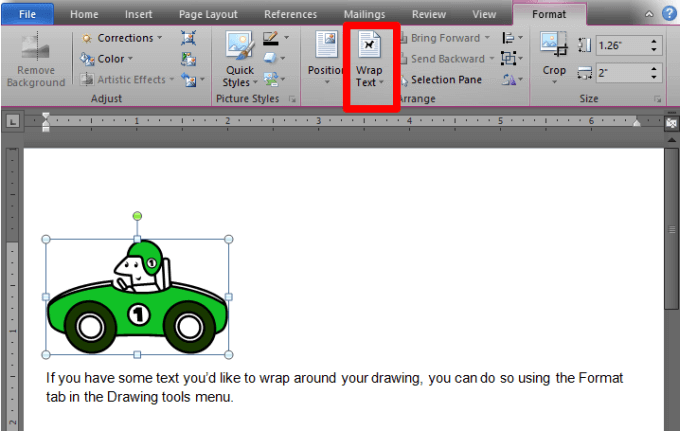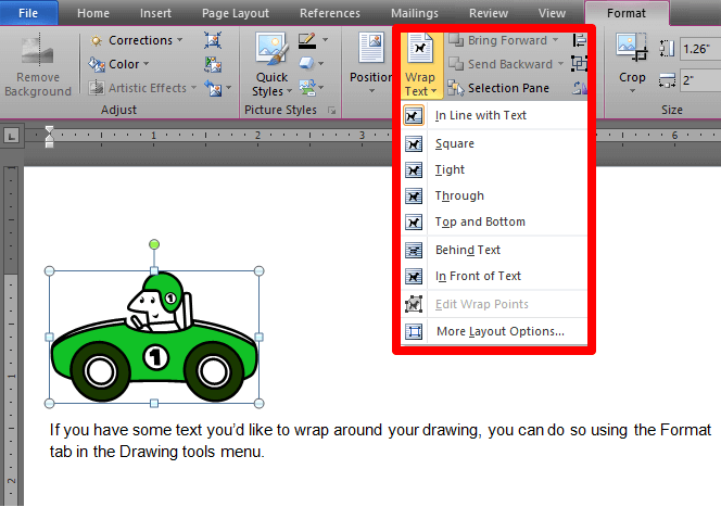 - To wrap text around your drawing, select the drawing and then select Wrap Text in the Format tab.