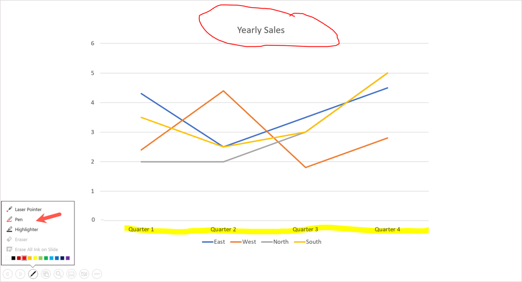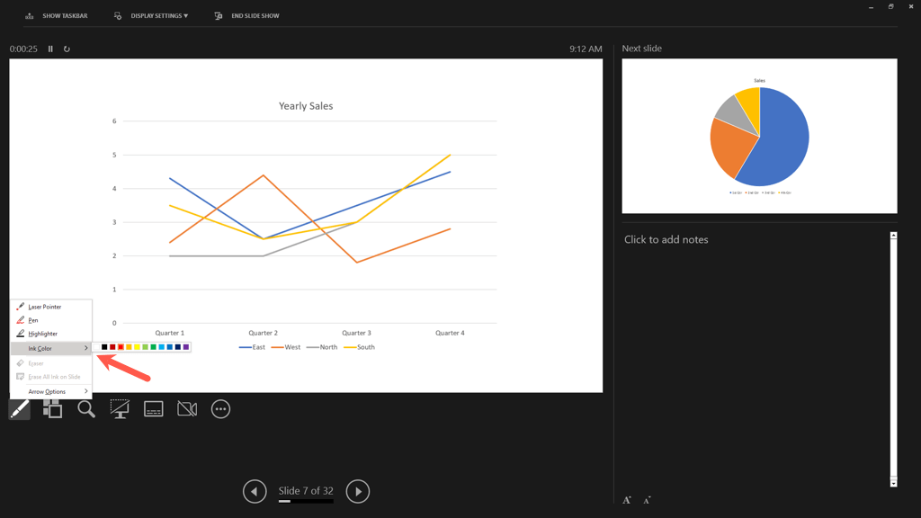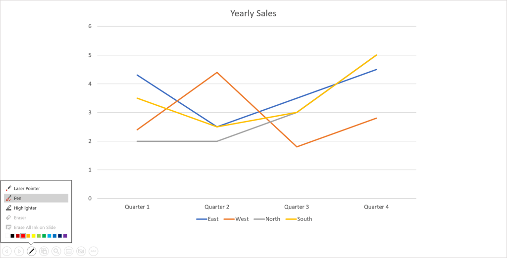 Tip: On Windows and Mac, you can also right-click the slide, move to Pointer Options, and use the pop-up menu to choose the tool or change the color.
