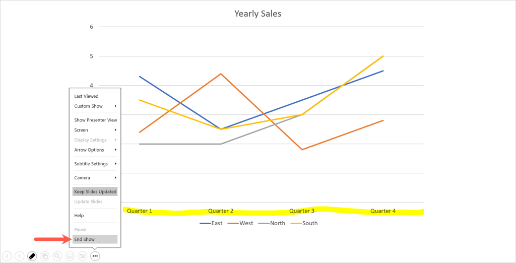 End the show as you normally would. You can do this by selecting the More Slide Show Options icon (three dots) in the toolbar or by right-clicking. Then, pick End Show. You can also use your Esc key to end a slideshow.