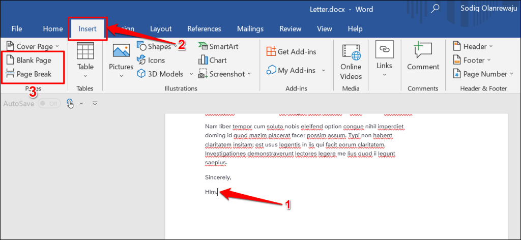 - Place your cursor at the end of the page, head to the Insert tab, and select Blank Page or Page Break. Both options add a new page to your document.