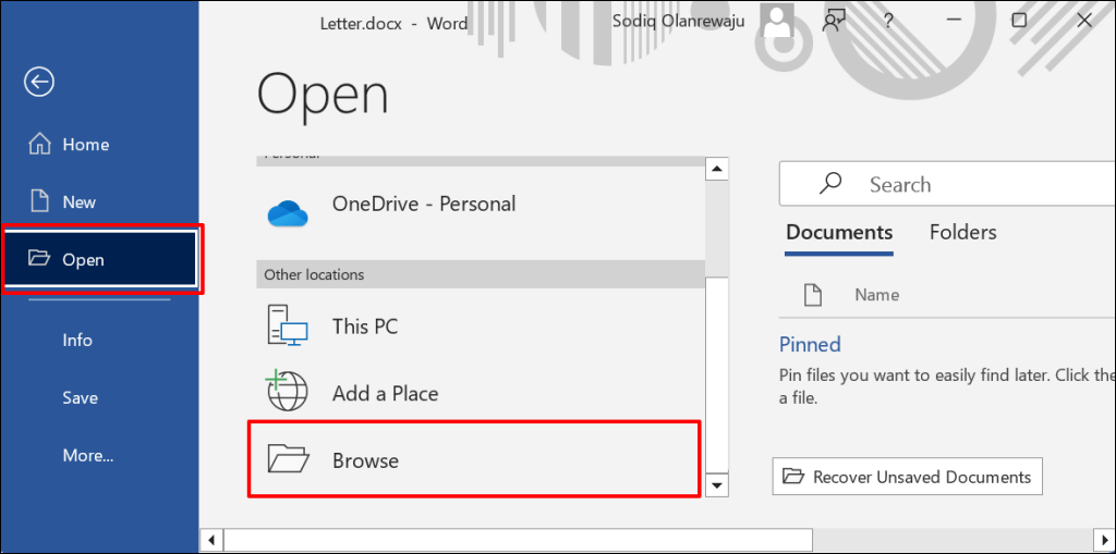 To duplicate the page onto an existing document, select Open on the sidebar and select the document from your file manager.