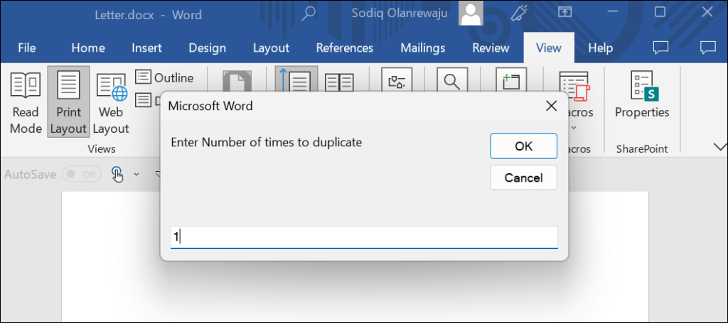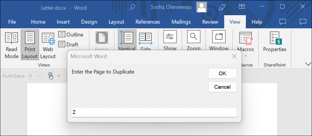 - Type how many copies of the page you want to duplicate and select OK. Microsoft Word will duplicate the selected page by the number of copies you selected.