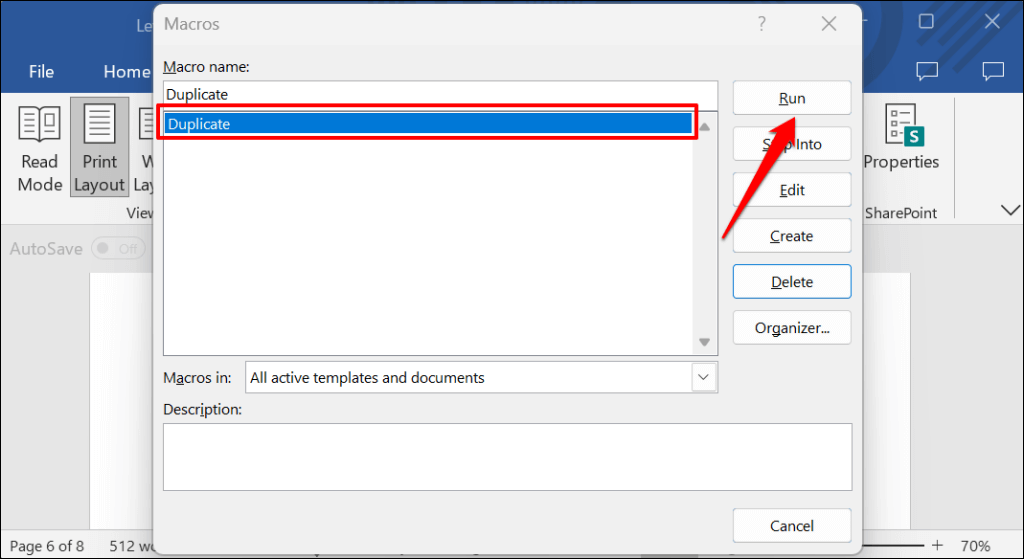 - Type Duplicate in the “Macro name” dialog box, and select Create.