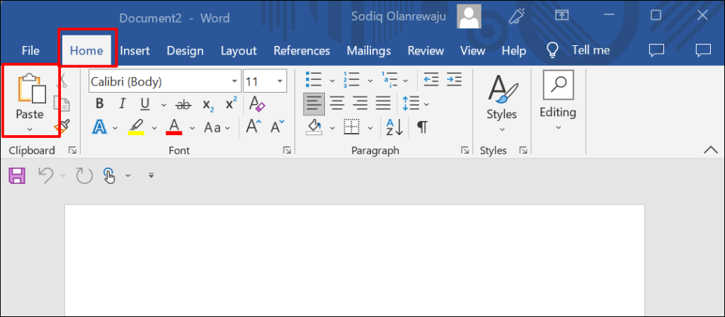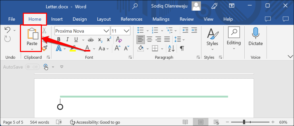 - Press Ctrl + V (Windows) or Command + V (Mac) to paste the copied page to the new document. Alternatively, select Paste in the “Home” tab.