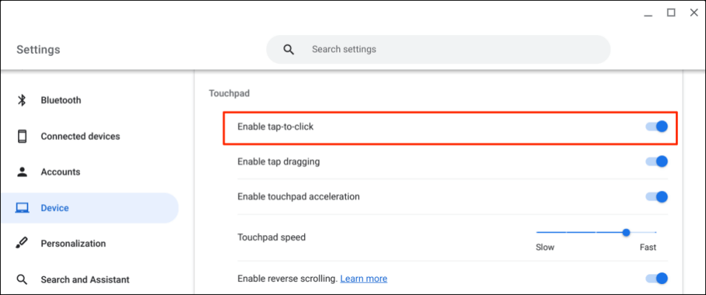 The “Tap-to-click” feature allows you to left-click in ChromeOS by tapping the trackpad or touchpad. Disable the feature if you unintentionally tap or brush your touchpad too often.