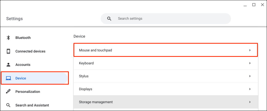 - Open your Chromebook’s Settings app, select Device on the sidebar, and select Mouse and touchpad.