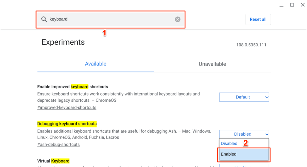 - Type keyboard in the search bar, open the Debugging keyboard shortcuts drop-down menu, and select Enabled.