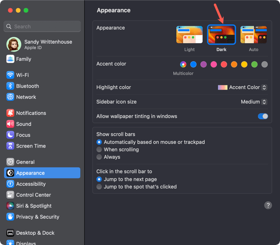 - At the top, pick Dark to enable dark mode. Alternatively, you can choose Auto to have your Mac use dark mode only in the darker hours of the day.