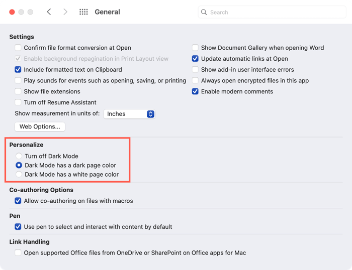 - Once you enter dark mode on your Mac, you adjust Word by opening the app and selecting Word > Preferences from the menu bar. * Go to General on the top left. * In the Personalize section, you have three options: * Turn off Dark Mode: Use this to disable dark mode in Word even if you enable it on your Mac. * Dark Mode has a dark page color: Use this to display the Word window, menus, and page color in dark mode.