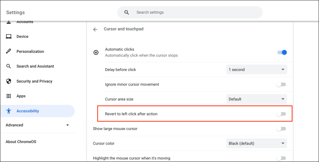 Want to turn off the auto-click tool? Head to Settings > Accessibility > Cursor and touchpad and toggle off Automatic clicks.