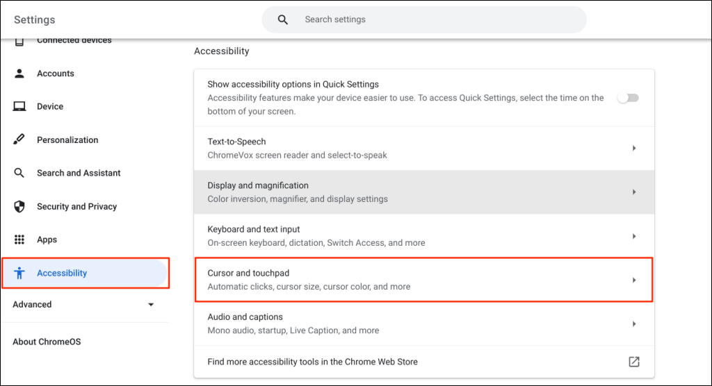 - Open Settings, open the Accessibility tab (on the sidebar) and select Cursor and touchpad (or Mouse and touchpad).