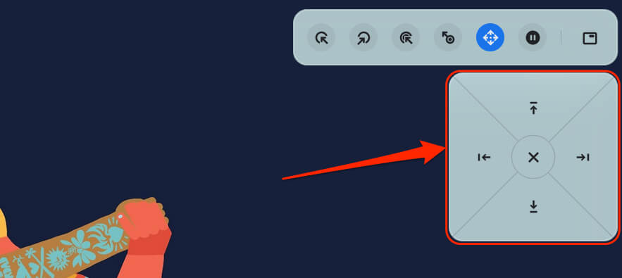 Place your cursor on the page or app you want to navigate and wait for the auto-click delay. Afterward, hover your cursor on the left/right/up/down arrow keys or scroll options to navigate the page. Finally, press the X icon in the middle to close the navigation bar—the auto-clicker reverts to the left-click option.