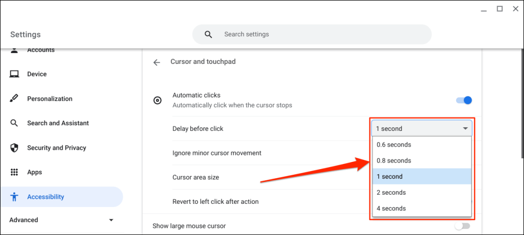 Turn on Automatic clicks, expand the “Delay before click” drop-down menu, and choose how long your Chromebook pauses before performing an auto-click action.