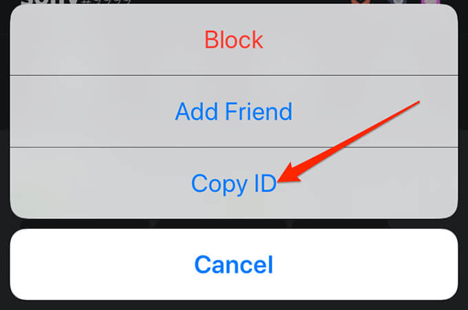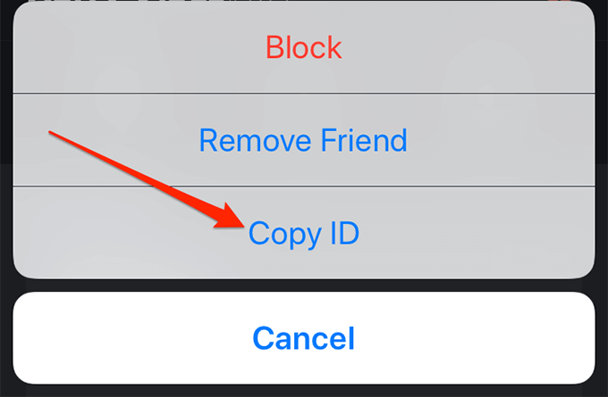 - If the user is in your list of friends, open your friends’ list, tap the user, scroll down, and select **Copy ID** at the bottom.