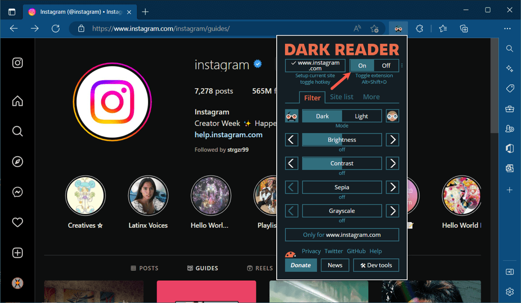 One more option to consider if you like to use dark mode on Windows for more sites than just Instagram is an all-inclusive add-on.