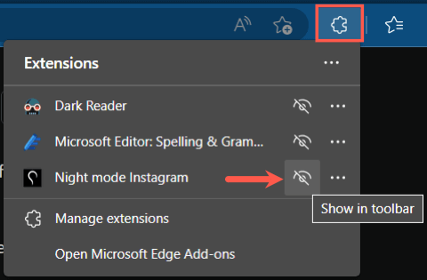 - After you install Night Mode Instagram, you can place the button in your toolbar for easy access. Select the extensions button (puzzle piece) and then the Show in toolbar icon (eye with a line) in the drop-down menu.