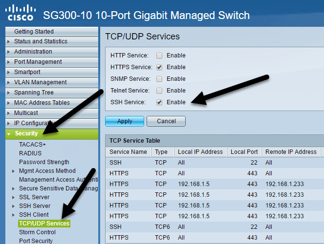 Once you are logged in, expand Security in the left-hand menu, then click on** TCP/UDP Services**. On the right-hand pane, you’ll see the different TCP and UDP services you can enable for your Cisco switch. In my case, I already had HTTPS checked, so I went ahead and checked** SSH Service** also.