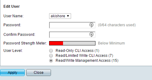 There are also other user levels and you may want to create another user account specifically for accessing the switch via SSH with limited write access. You can do this by adding a user and then choosing the appropriate user level for that account.