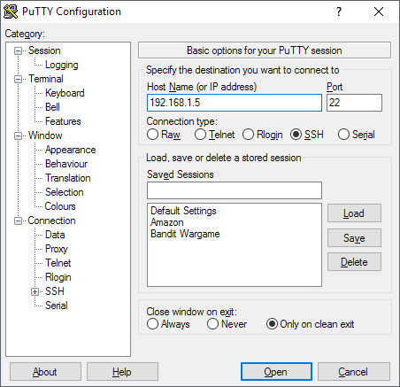 Now all you have to do is use your favorite SSH client to log into the switch. I use puTTY and will use that for any examples. Open puTTY and enter the IP address for your switch. Make sure SSH is selected and you should be good to go.