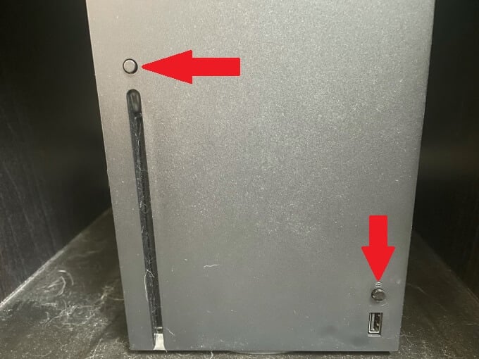 - Press the **Xbox **button on the front of the console and continue holding the **Pair **and **Eject **buttons for 10 to 15 seconds.