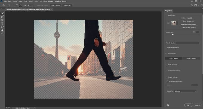 You can make your selection more precise here using the brush tools. When you’re happy with the selection, go to the Output Settings dropdown and in the Output To setting, choose New Layer with Layer Mask and select OK.
