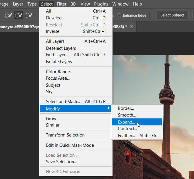 Go to Select > Modify > Expand so that the selection goes a bit over the edge of your subject. Now, make sure your background layer is highlighted by selecting it.
