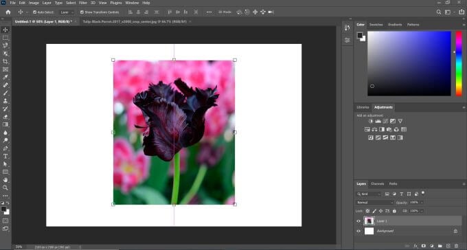 Once you have your project created, open the image you want to feather the edges of by going to File > Open. The image will open in a new tab in photoshop. You’ll be working in this tab now to feather the image.
