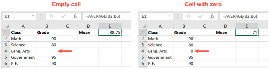 Something to keep in mind when using the AVERAGE function is that blank cells are not the same as cells with zeros. To avoid skewing your formula’s result, enter zeros in any empty cells if the intended value there is zero.