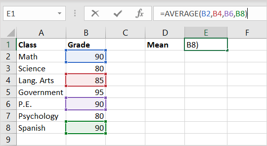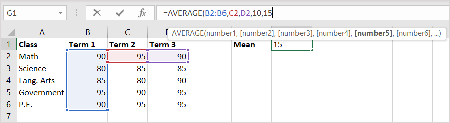 If you want to enter the numbers that you want the mean for, you simply type them into the formula as arguments. Be sure to separate the numbers with commas.