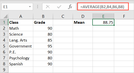 =AVERAGE(B2,B4,B6,B8)