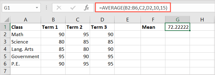 Here, we’ll find the average for cells B2 through B6, C2 and D2, and the numbers 10 and 15 using this formula: