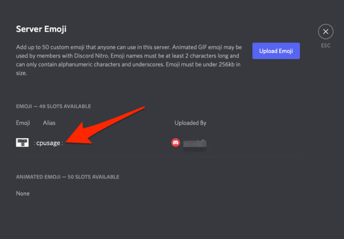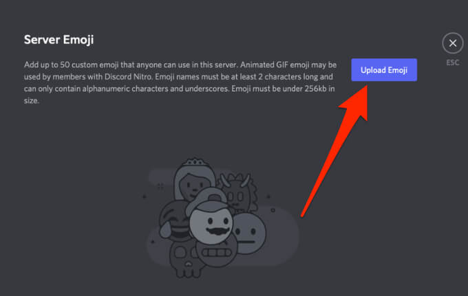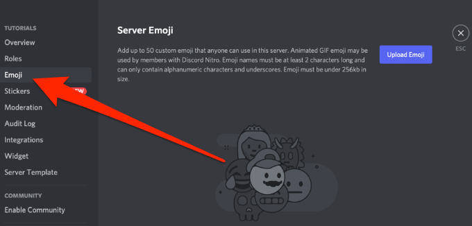 - Next, select the **Emoji** tab to upload up to 50 custom emojis to your personalized stash. This way, anyone on the Discord server can use emojis.