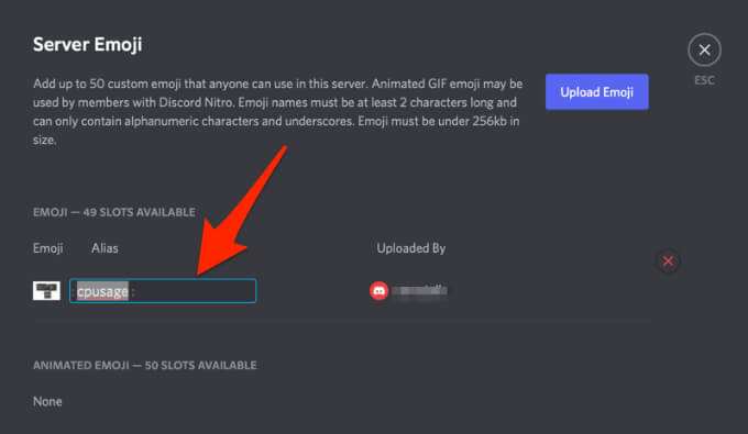 - You can select the Alias box next to a custom emoji and then type a new name to replace the default alias.