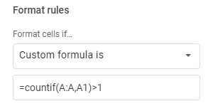 However, it will need to be modified to replace all instances of “A” with the column letter that is being searched for duplicates in Google Sheets, which will be shown in the Apply to range field.