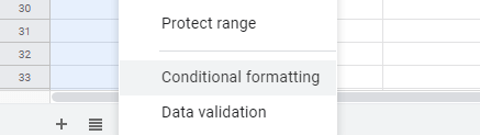 Once highlighted, right-click and select Conditional formatting. This will bring up a panel on the right side of the window that shows conditional formatting rules. The column range selected will be prefilled in the Apply to range field, so that won’t need to be touched.