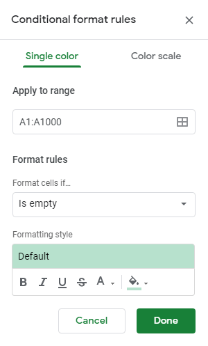 However, should the conditional formatting rule ever need to be deleted, it’s as simple as clicking on the Format menu and then Conditional formatting, which will show the same right-side menu as before. Users can hover their cursor over the row that shows the custom formula we’ve just created and click on the trash can icon that appears to remove it.