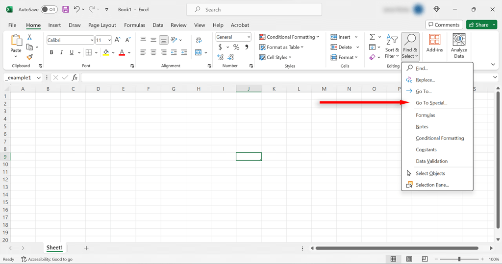 - Under Formats, choose Find & Select and then Go to Special.