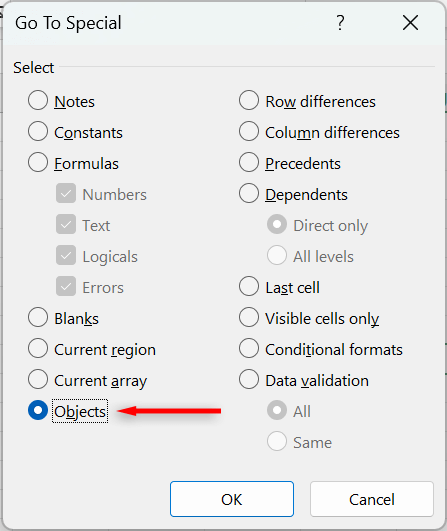 - In the Go to Special dialog box, tick the circle next to Objects and press OK.