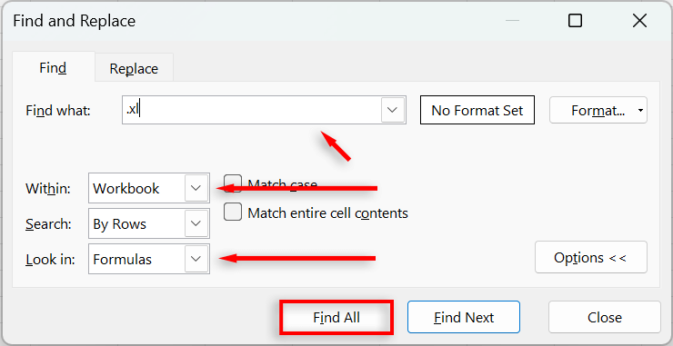 The first way to find external links is by searching within cell formulas. To do so, you need to use the Excel Find feature: