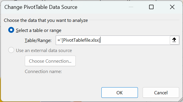- Check whether the source file next to “Table/Range” links to your current workbook or another workbook.