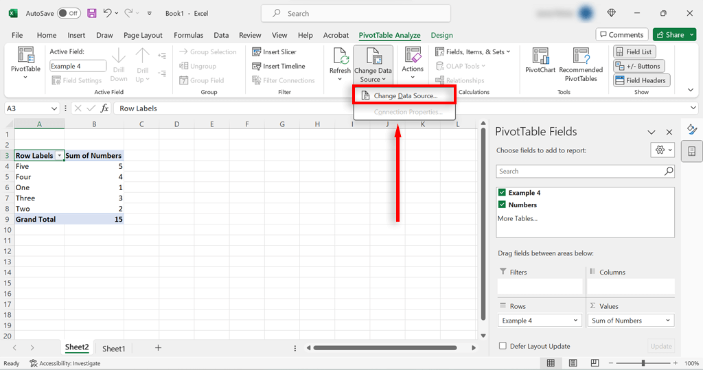 - Under the PivotTable Analyze tab, select Change Data Source.