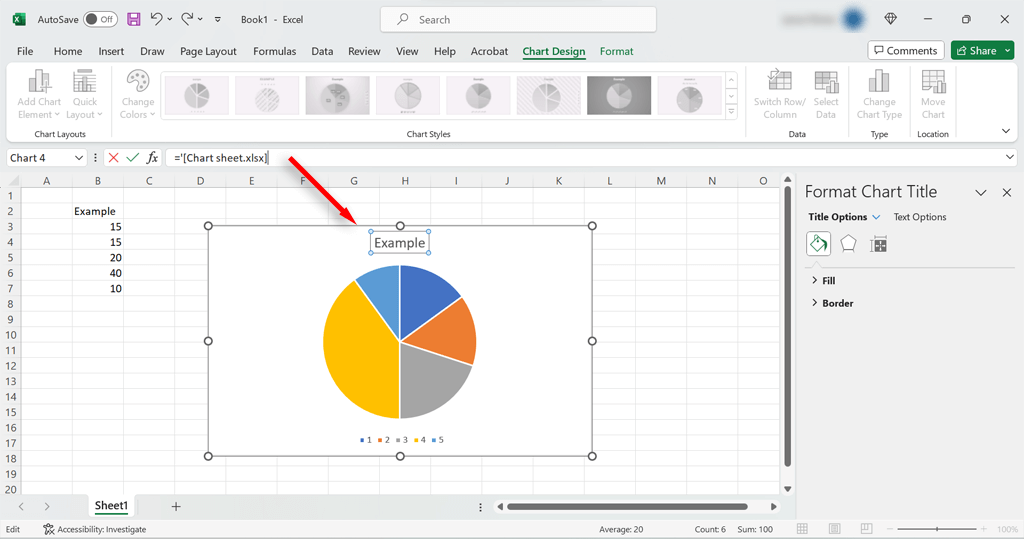 - Select the chart title and check the formula bar for a reference to another file.