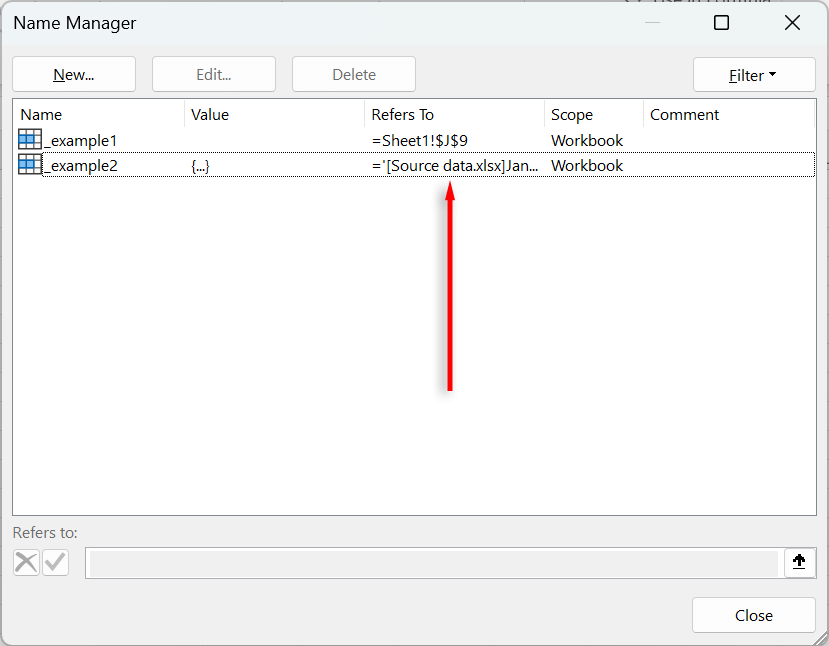 - For each entry in the list, check the Refers To column. Links to external workbooks should be surrounded by square brackets, making them easy to find.