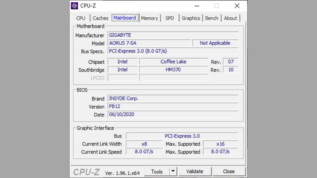 All you have to do is download the application and install it. Then run it on your computer. In the case of CPU-Z, you’ll have to switch to the “Mainboard” tab, and then you should see this.